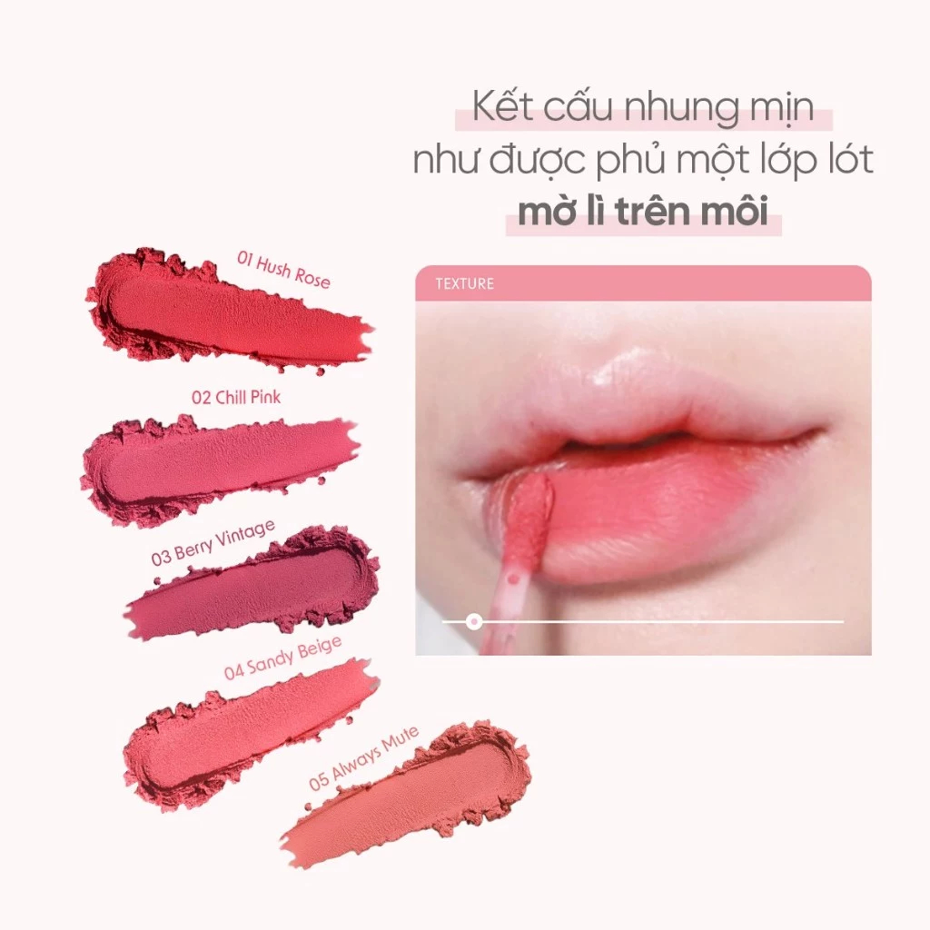 - Công dụng: Tạo màu cho môi với chất son nhẹ như mây, không khô môi, dễ dàng tạo hiệu ứng blur tự nhiên khi tán son.