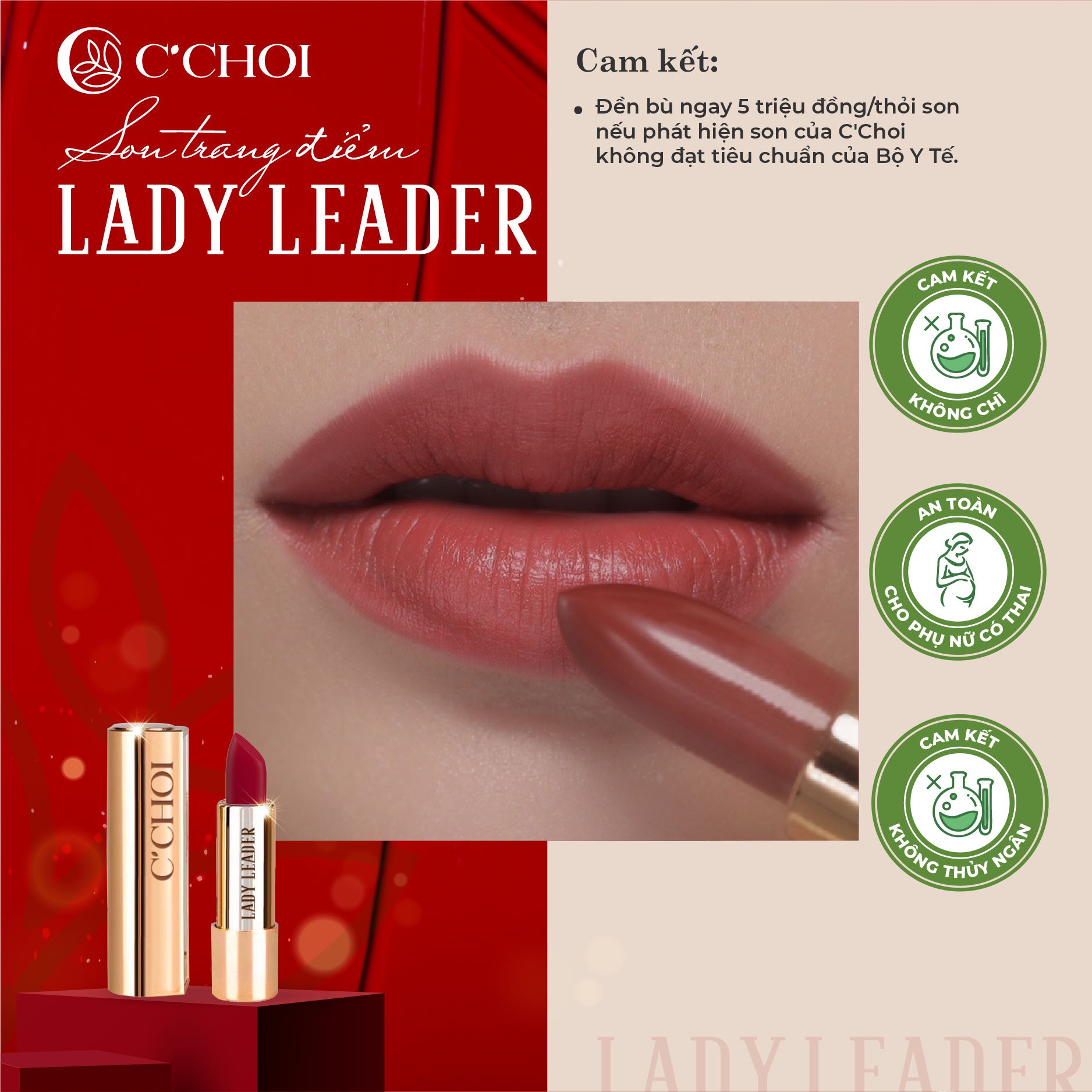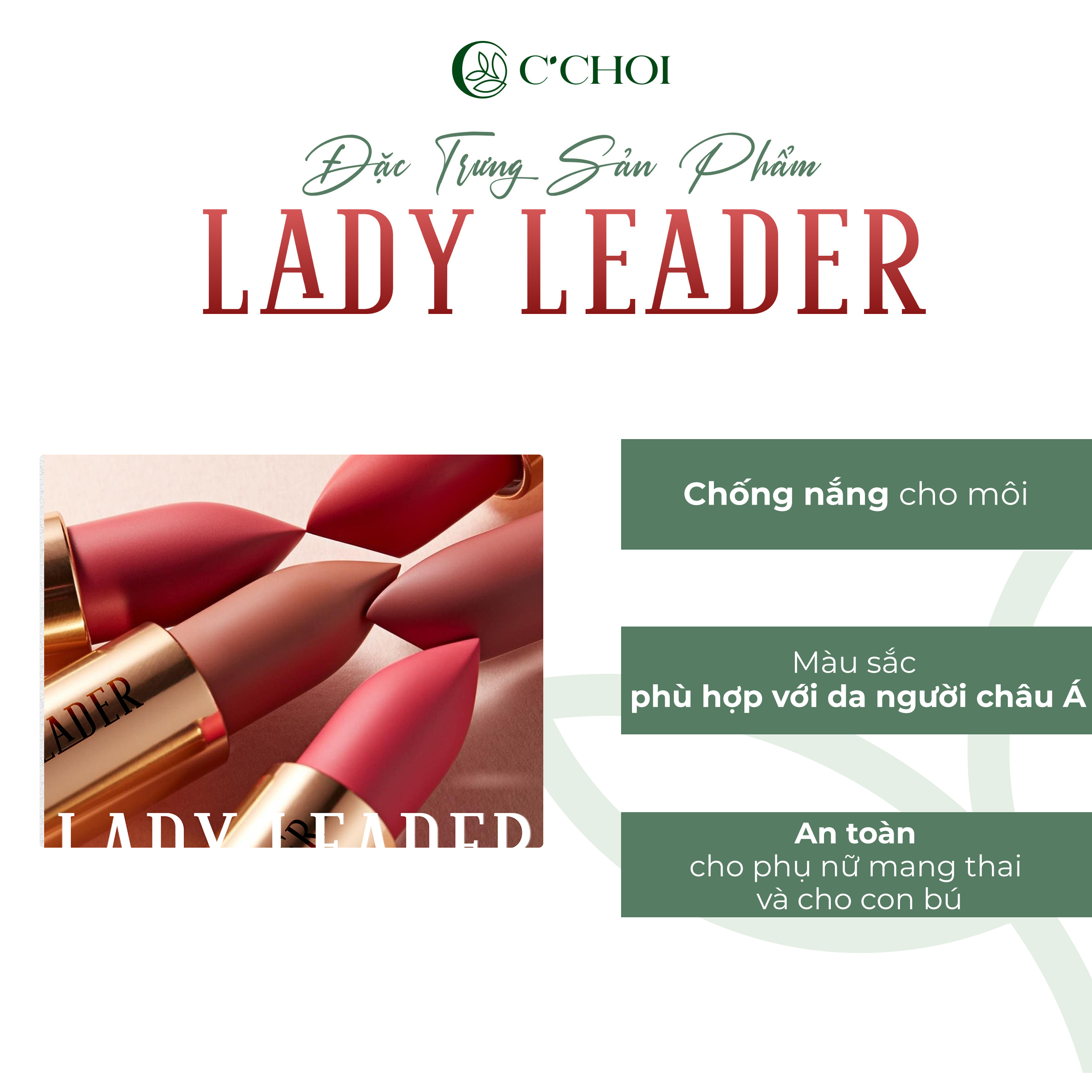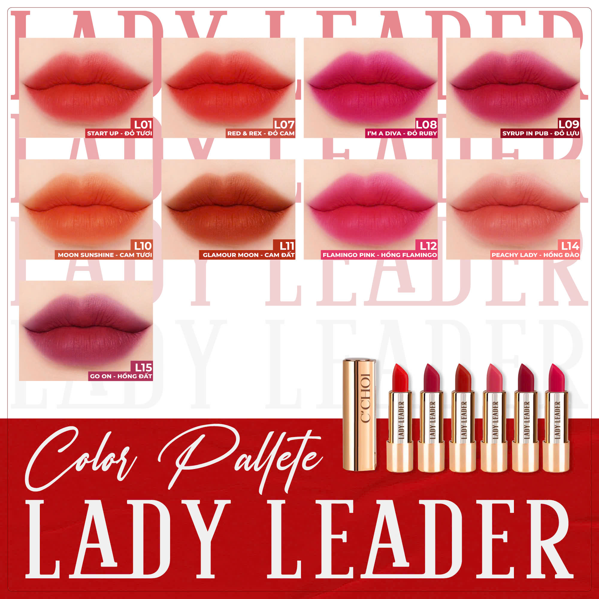 • Son sáp Lady Leader gồm 9 gam màu nắm bắt xu hướng và được yêu thích nhất hiện nayL01 – Start Up : Đỏ TươiL07 – Red & Rex: Đỏ CamL08 – I'm a diva: Đỏ Ruby L09 – Syrup in Pub: Đỏ Lựu L10 – Mon Sunshine: Cam TươiL11 – Glamour Moon: Cam ĐấtL12 – Flamingo Pink: Hồng FlamingoL14 – Peachy Lady: Hồng ĐàoL15 – Go on: Hồng Đất ( Phiên bản màu 2024)Thiết kế từng thỏi son đẹp như một món trang sức của phụ nữ, có kèm gương soi tiện dụng.