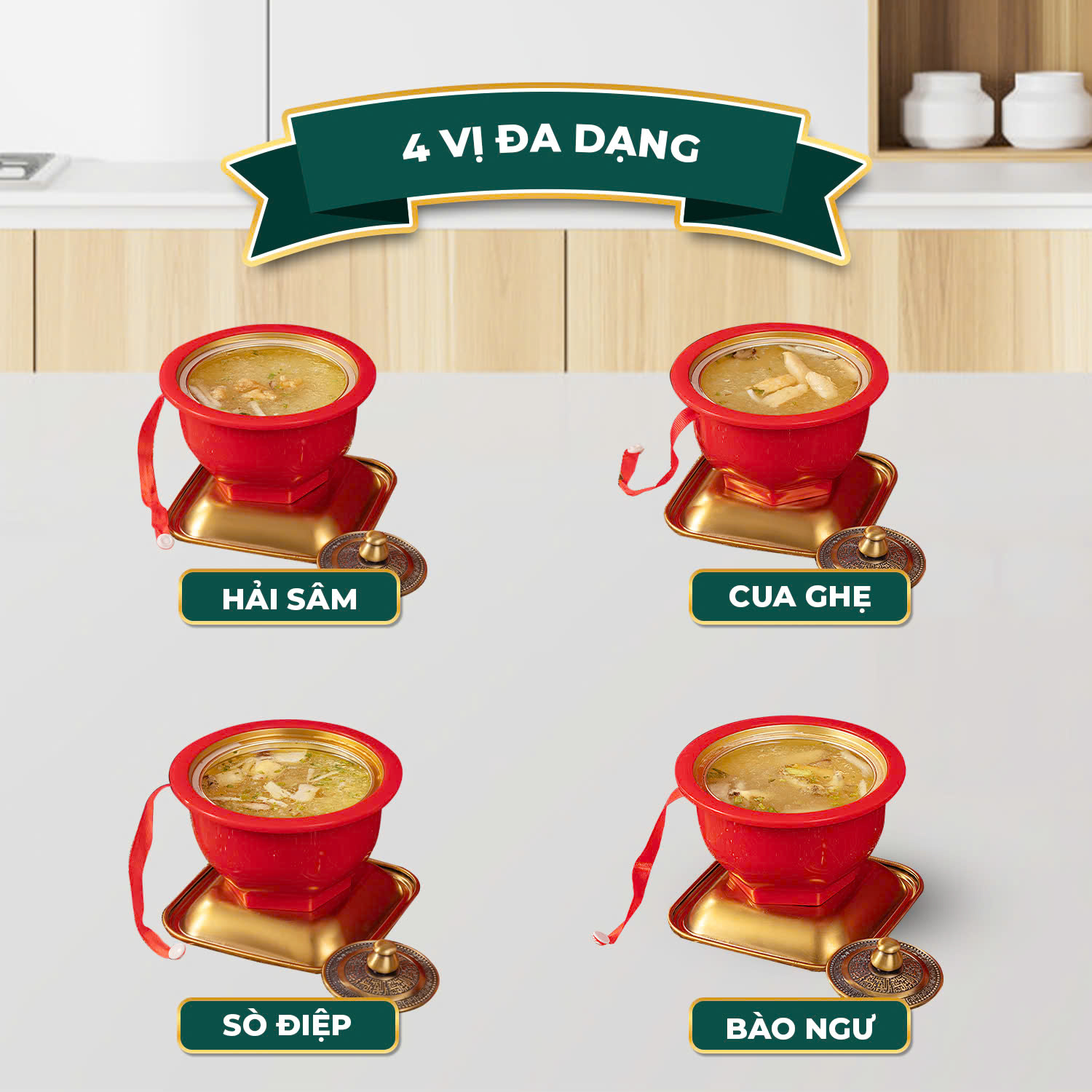 SÚP YẾN TỰ SÔI, SẤY THĂNG HOA THƯỢNG HOÀNG YẾN GỒM 4 VỊ HẢI SẢN: Hải sâm, Cua ghẹ, Sò điệp, Bào ngư