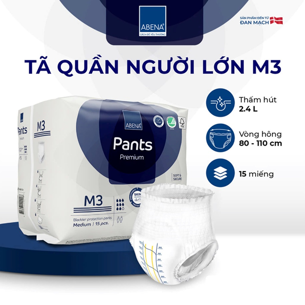 - Tã quần người lớn Abena Pants Premium M3 là dòng tã quần cao cấp, được thiết kế chuyên biệt phù hợp với người lớn tuổi, phụ nữ sau sinh hay người lớn gặp phải các vấn đề về việc kiểm soát bài tiết,.
