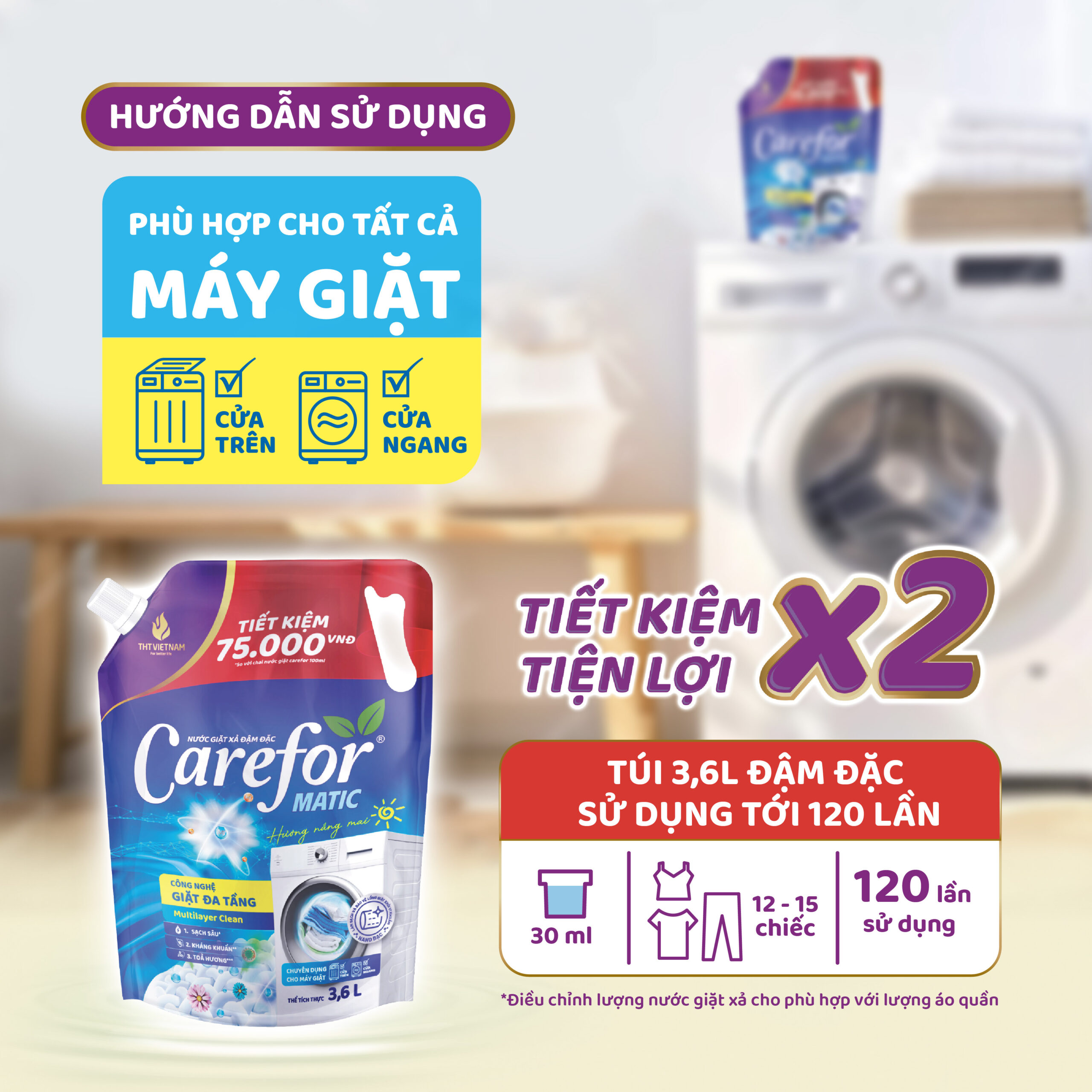 - Công dụng: Nước giặt xả Carefor Matic - sử dụng công nghệ giặt đa tầng mang lại 3 tác động sâu chỉ trong 1 lần giặt: Sạch sâu - Kháng khuẩn - Tỏa hương giúp quần áo luôn sạch sẽ và thơm mát.
