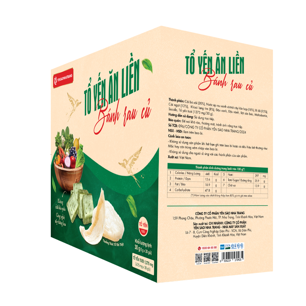 - Tổ yến ăn liền bánh rau củ là sự kết hợp hoàn hảo từ Tổ yến với hơn 10 loại rau củ giàu chất dinh dưỡng, bổ sung chất sơ và vitamin.
