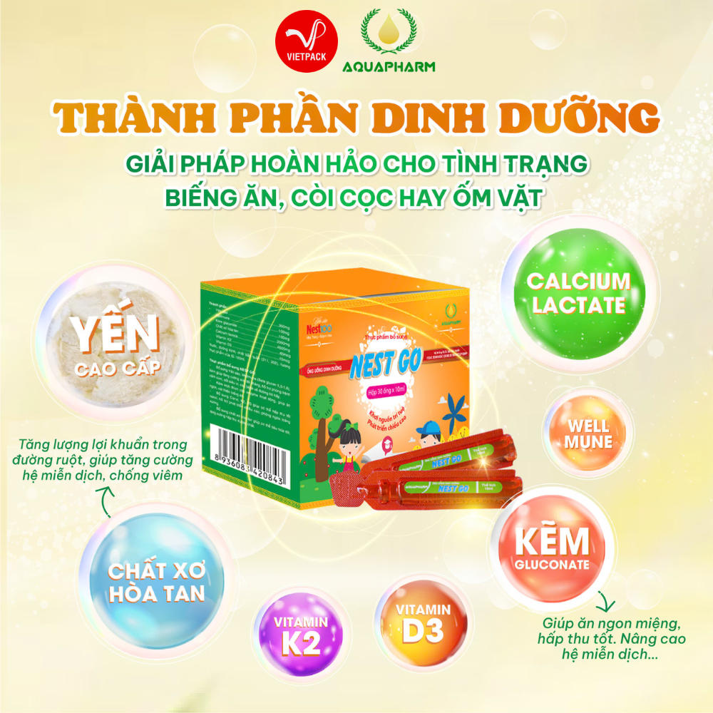 - Tên sản phẩm: Ống Uống Dinh Dưỡng Nest Go Thương hiệu: Aquapharm Xuất xứ: Việt Nam Thành phần: trong 100 ml (10 ống) chứa: Yến Sào: 300mg Wellmune: 100mg Kẽm Gluconate: 100mg Chất xơ hòa tan: 2000mg Calcium lactate: 4500mg Vitamin K2: 60mcg Vitamin D3: 15mcg Công dụng:Bổ sung Yến sào, Wellmune, Kẽm tăng cường sức đề kháng, hỗ trợ phòng bệnh cảm cúm, sốt siêu vi, các bệnh về đường hô hấp.