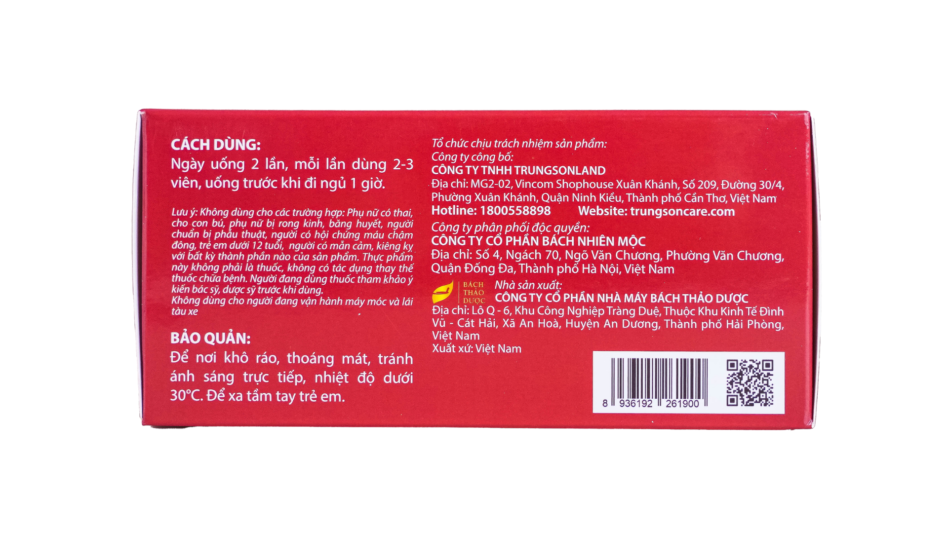 - Khối lượng trung bình viên: 600mg ± 7,5% (đã bao gồm vỏ nang) Số XNQC: Số ĐKSP: 1889/2022/ĐKSPSản xuất tại:CÔNG TY TNHH BÁCH THẢO DƯỢCĐịa chỉ: Lô Q - 6, Khu Công Nghiệp Tràng Duệ, Thuộc Khu Kinh Tế Đình Vũ - Cát Hải, Xã An Hòa, Huyện An Dương, Thành phố Hải Phòng, Việt NamXuất xứ: Việt Nam Thương nhân chịu trách nhiệm sản phẩm:CÔNG TY TNHH TRUNGSONLANDĐịa chỉ: MG2-02, Vincom Shophouse Xuân Khánh, Số 209, Đường 30/4, Phường Xuân Khánh, Quận Ninh Kiều, Thành phố Cần Thơ, Việt NamĐiện thoại: 1800558898Đơn vị phân phối độc quyền:CÔNG TY CỔ PHẦN BÁCH NHIÊN MỘC Địa chỉ: Số 4, Ngách 70, Ngõ Văn Chương, Phường Văn Chương, Quận Đống Đa, Thành phố Hà Nội, Việt NamĐiện thoại: 0386080608.