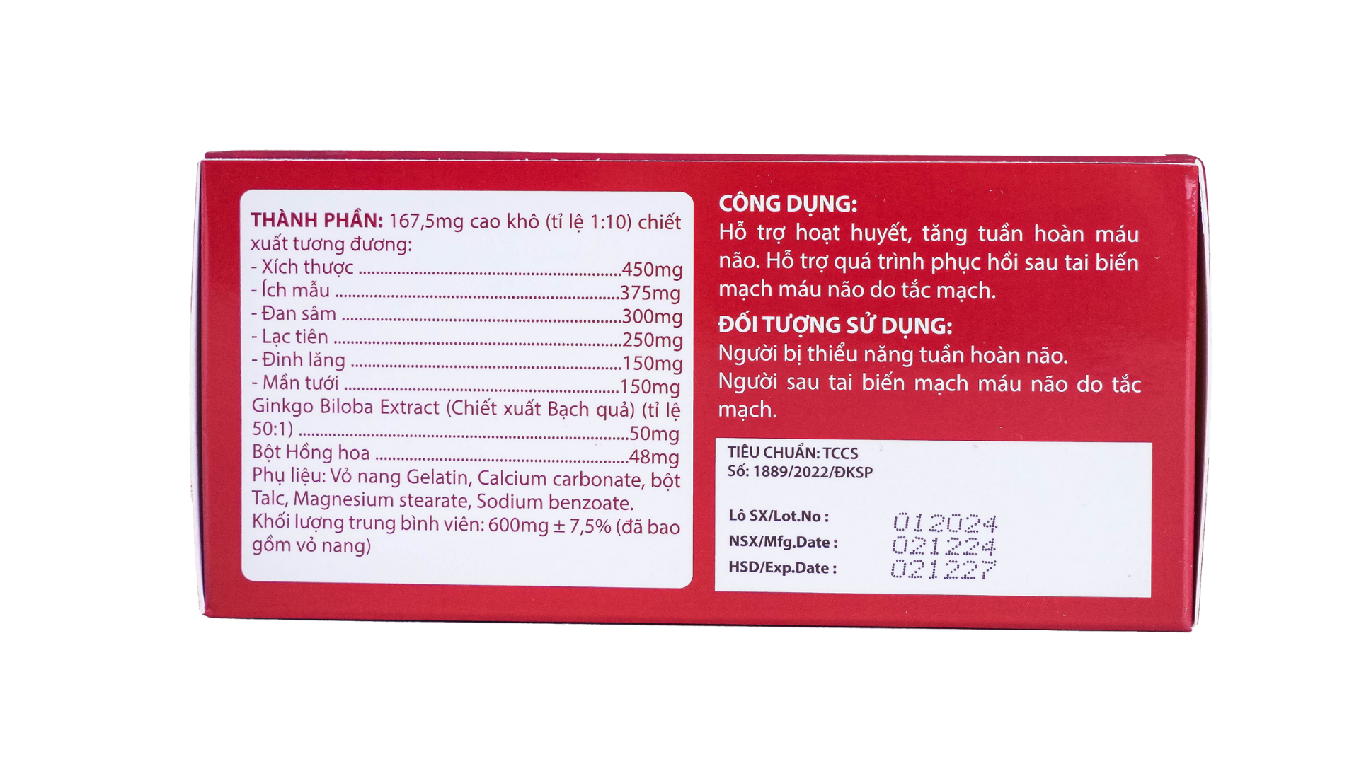 - TPBVSK Hoạt Huyết Bách Nhiên Mộc Thành phần:167,5mg cao khô (tỉ lệ 1:10) chiết xuất tương đương:STTTHÀNH PHẦNĐƠN VỊ TÍNHHÀM LƯỢNG1Xích thượcmg/viên450 mg2Đan sâmmg/viên375 mg3Lạc tiênmg/viên300 mg4Ích mẫumg/viên250 mg5Bình linhmg/viên150 mg6Mạn kinh tửmg/viên150 mg7Ginkgo Biloba Extract (Chiết xuất Bạch quả)mg/viên50 mg8Bột Hồng hoamg/viên48 mgPhụ liệu: Vỏ nang Gelatin, Calcium carbonate, bột Talc, Magnesium stearate, Sodium benzoate.
