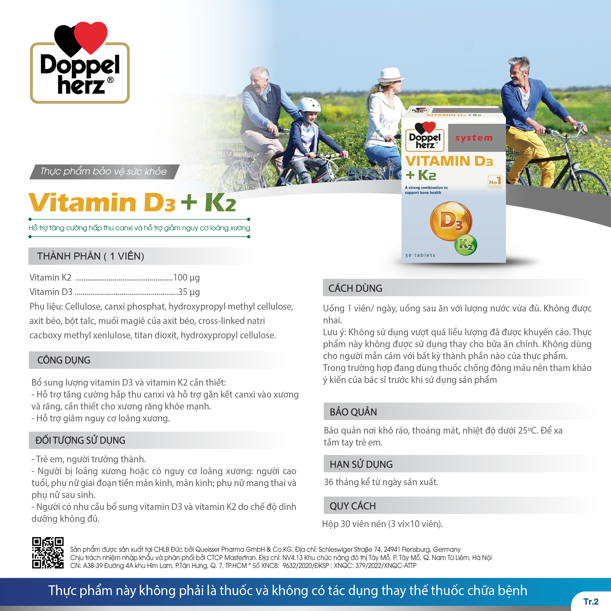 - Thành phần: hàm lượng có trong 1 viênThành phầnHàm lượng 1 viênVitamin D3 (Cholecalciferol)35 µg Vitamin K2 (Menaquinone)100 µgPhụ liệu: Chất độn (Xenlulose vi tinh thể, Dicanxi phosphat, Hydroxypropyl methyl cellulose), chất chống đông vón (Canxi cacbonat, Axit béo, Muối Magie của axit béo), chất ổn định (Cross-linked natri cacboxy methyl xenlulose), chất kết dính (Polyethylene glycol).