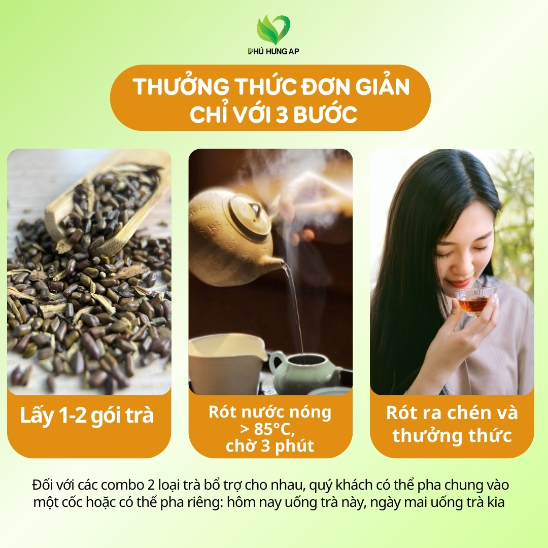 Cách 1 : Cho 10 g trà trong túi  vào  bình hoặc chuyên chút  300ml – 500ml nước sôi 100℃. Ngâm  từ 1- 2 phút là dùng được ( Ngâm  nhiều lần để tận dụng hết dược tính )