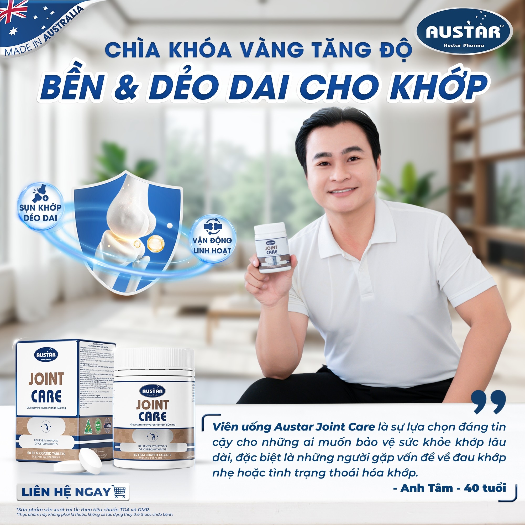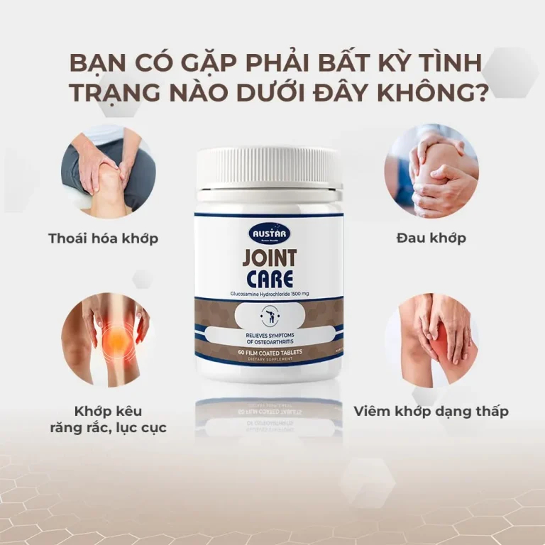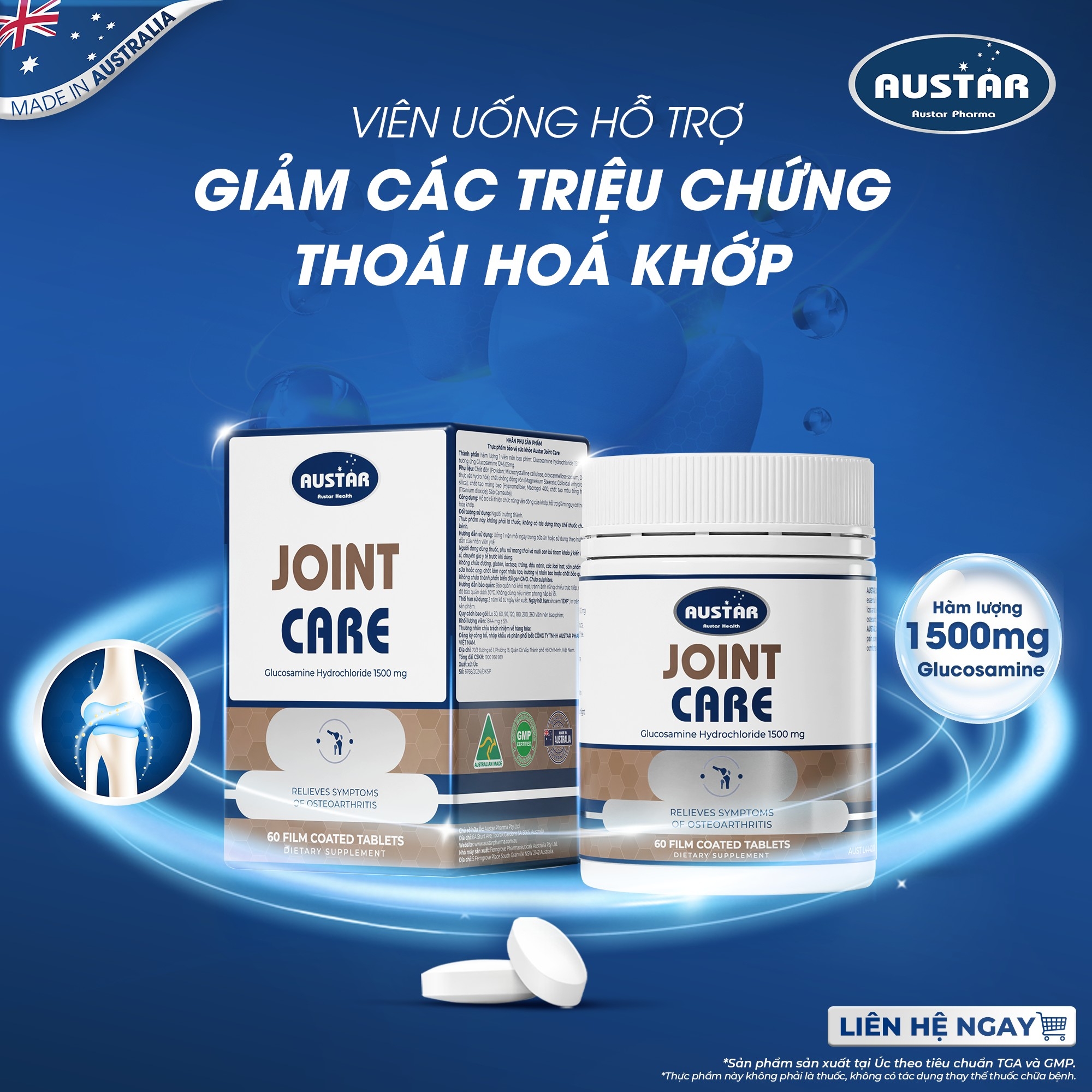 - Giới thiệuViên uống AUSTAR Joint Care là gì?Viên uống AUSTAR Joint Care là sản phẩm hỗ trợ xương khớp, cung cấp dưỡng chất quan trọng là Glucosamine giúp hỗ trợ điều trị và phòng ngừa các vấn đề về xương khớp như viêm khớp nhẹ và thoái hóa khớp.