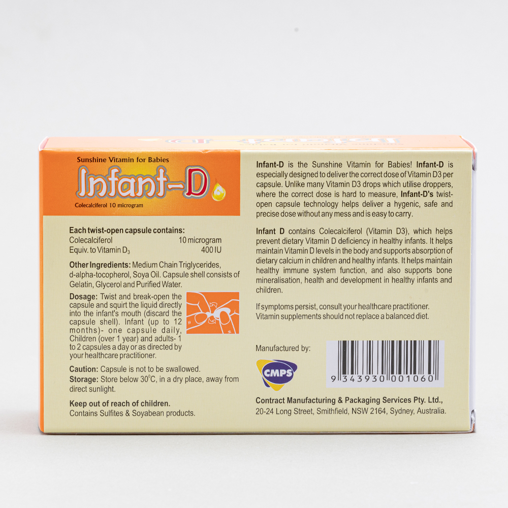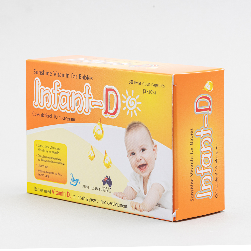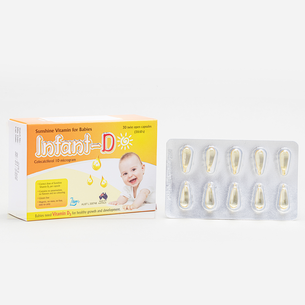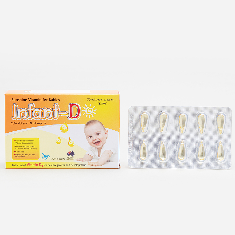 Infant D là vitamin từ ánh nắng quan trọng cho trẻ em. Infant D được sản xuất nhằm cung cấp liều chính xác vitamin D3 nhất cho trẻ em. Không giống các dạng vitamin D3 nhỏ giọt khác rất khó để dùng chính xác liều lượng. Viên infant D giúp bổ sung chính xác liều lượng, vệ sinh và dễ mang theo sử dụng.