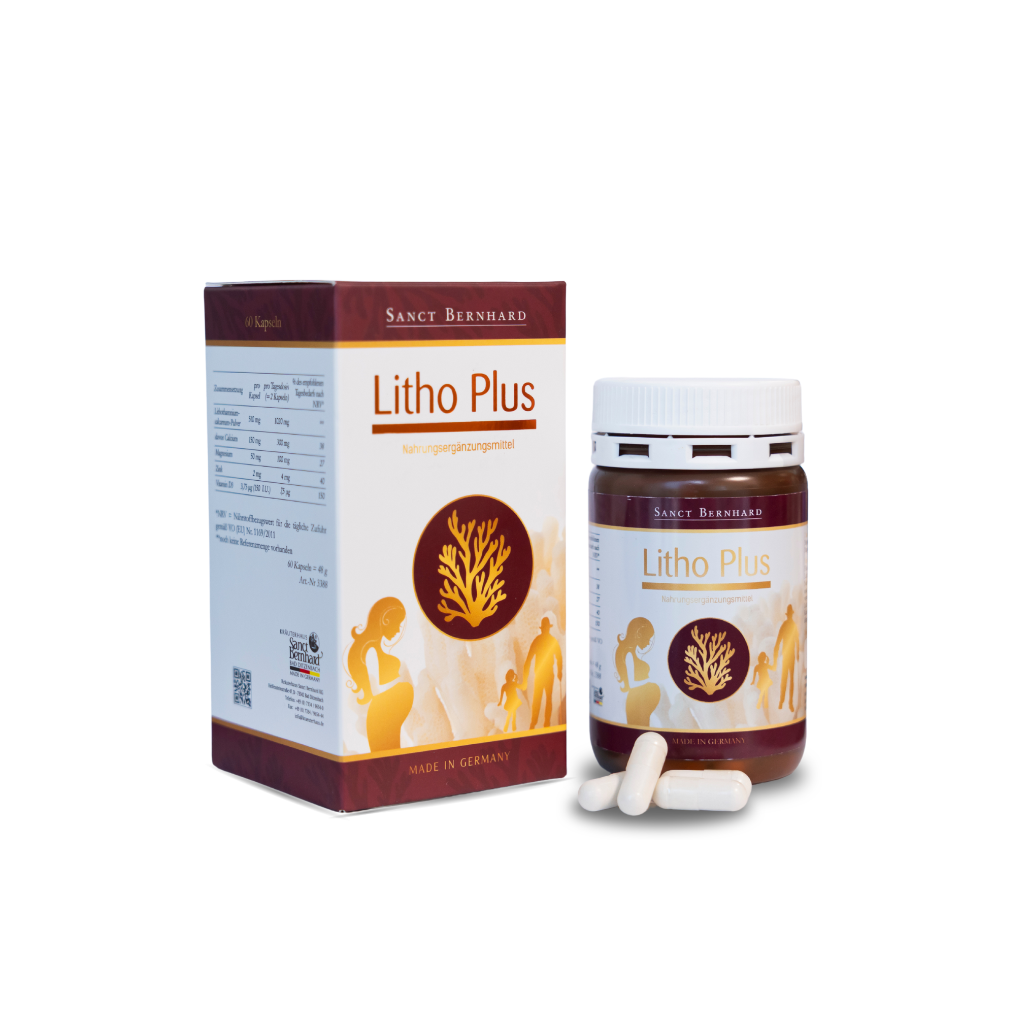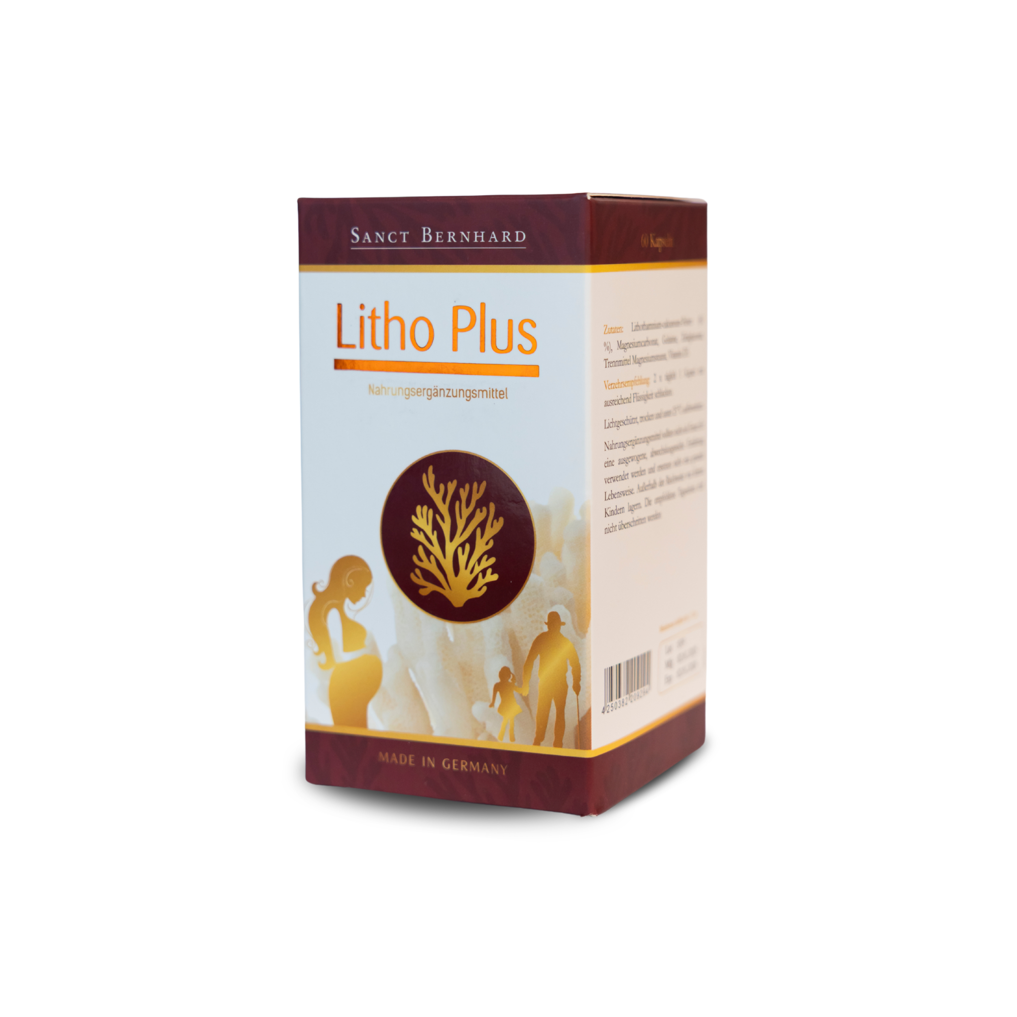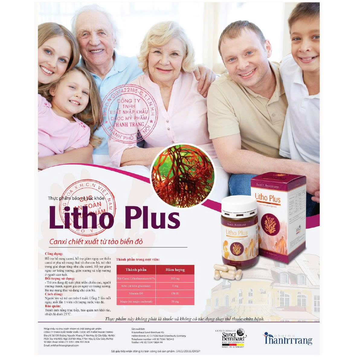 - Thực phẩm bảo vệ sức khỏe: LITHO - PLUSThành phần: trong 1 viên chứa:STT THÀNH PHẦNĐƠN VỊ TÍNH HÀM LƯỢNG1Bột canxi Lithothamnium (61%) (trong đó Canxi: 150mg)(canxi từ tảo đỏ)mg/viên510mg2Magie (từ Magie carbonate)mg/viên50mg3Kẽm (từ Kẽm gluconat)mg/viên2mg4Vitamin D3 (cholecalciferol)mcg/viên3,75 mcg5Phụ liệu: gelatin, chất giải phóng magie stearat vừa đủ 1 viênmg/viên800mgCông dụng:Bổ sung canxi, giúp hỗ trợ giảm nguy cơ thiếu canxi ở phụ nữ mang thai và cho con bú, trẻ nhỏ trong giai đoạn tăng nhu cầu canxi.