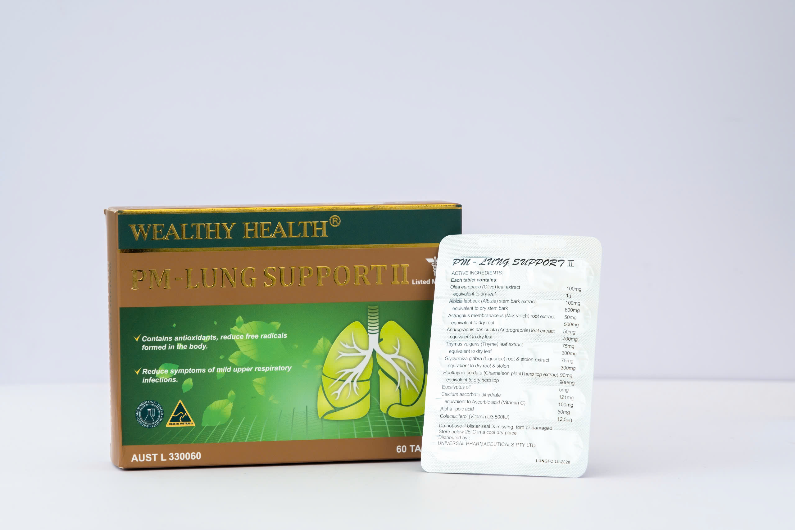 - Tên sản phẩm: Thực phẩm bảo vệ sức khỏe PM-Lung Support II (Viên uống bảo vệ, tăng cường chức năng phổi nhập khẩu nguyên hộp từ Úc)Thương hiệu: Wealthy HealthXuất xứ: ÚcThành phần Hàm lượng 1 viên nén chứa: Thành phầnHàm lượngChiết xuất từ thực vật Chiết xuất lá Ô liu (Olea europaea)100mg (tương đương lá ô liu khô 1g)Chiết xuất vỏ thân bồ kết tây (Albizia lebbeck)100mg (tương đương vỏ thân bồ kết tây khô 800mg)Chiết xuất rễ hoàng kỳ (Astragalus membranaceus)50mg (tương đương rễ hoàng kỳ khô 500mg)Chiết xuất lá xuyên tâm liên (Andrographis paniculata)50mg (tương đương lá xuyên tâm liên khô 700mg)Chiết xuất lá cỏ xạ hương (Thymus vulgaris)75mg (tương đương lá cỏ xạ hương khô 300mg)Chiết xuất rễ và thân cam thảo (Glycyrrhiza glabra)75mg (tương đương rễ và thân cam thảo khô 300mg)Chiết xuất phần trên mặt đất của cây diếp cá (Houttuynia cordata)90mg (tương đương phần trên mặt đất cây diếp cá khô 900mg)Tinh dầu Tinh dầu bạch đàn5mgVitamin và dưỡng chất khác Calcium ascorbate dihydrate (tương đương Vitamin C)121mg (tương đương Vitamin C 100mg)Acid alpha lipoic50mgColecalciferol (Vitamin D3 5000IU)12,5mcgTá dược Calcium hydrogen phosphate dihydrate, Sáp Carnauba, chất tạo màu tổng hợp (phức hợp chlorophyllin-đồng), croscarmellose sodium, crospovidone, dl-alpha-tocopherol, dầu đậu nành hydrogenated, gelatin được thủy phân, hypromellose, macrogol 400 (Polyethylen glycol), magnesium stearate, tinh bột ngô, microcrystalline cellulose, povidone, silicon dioxide, sucrose, titanium dioxide.