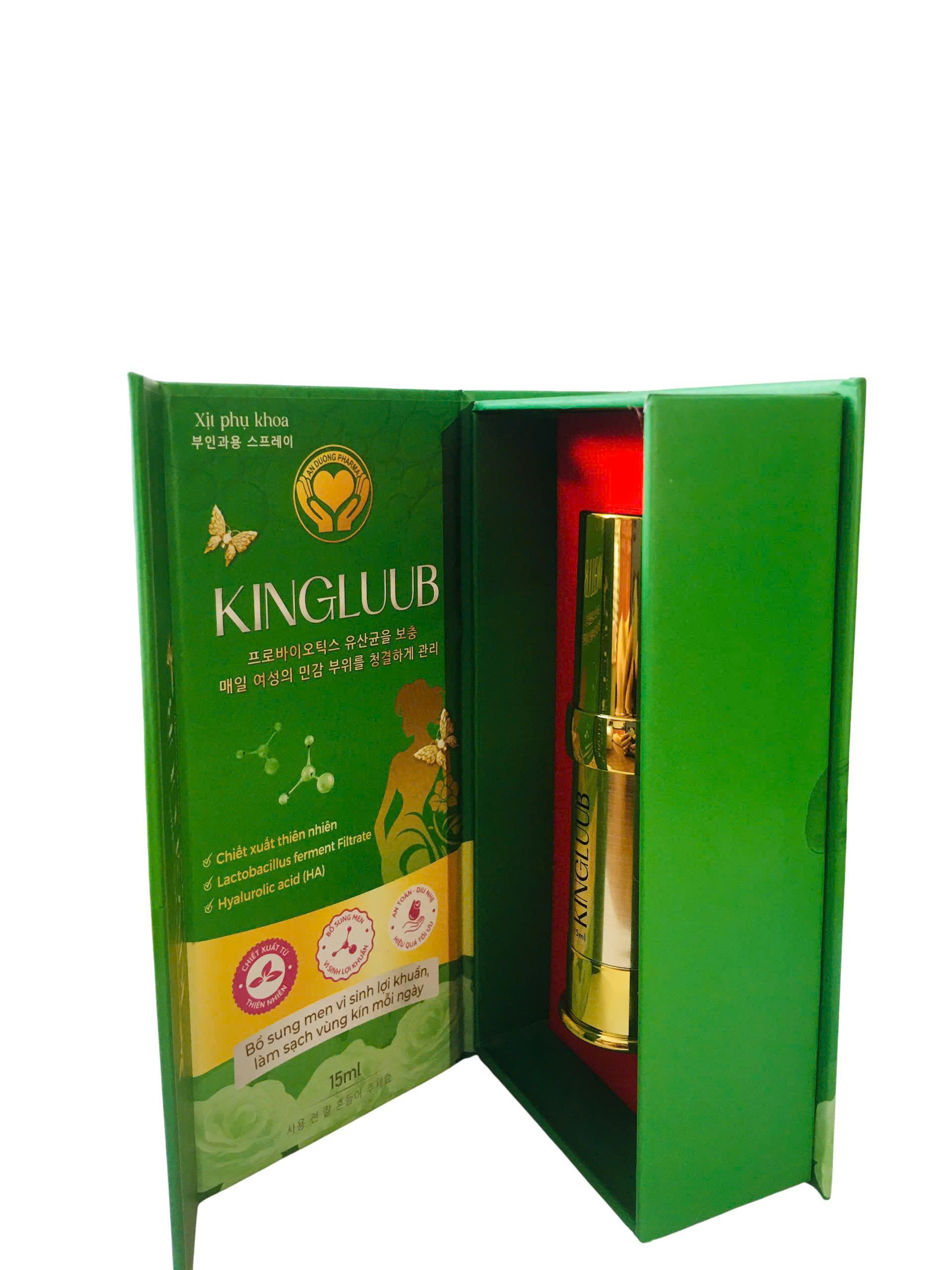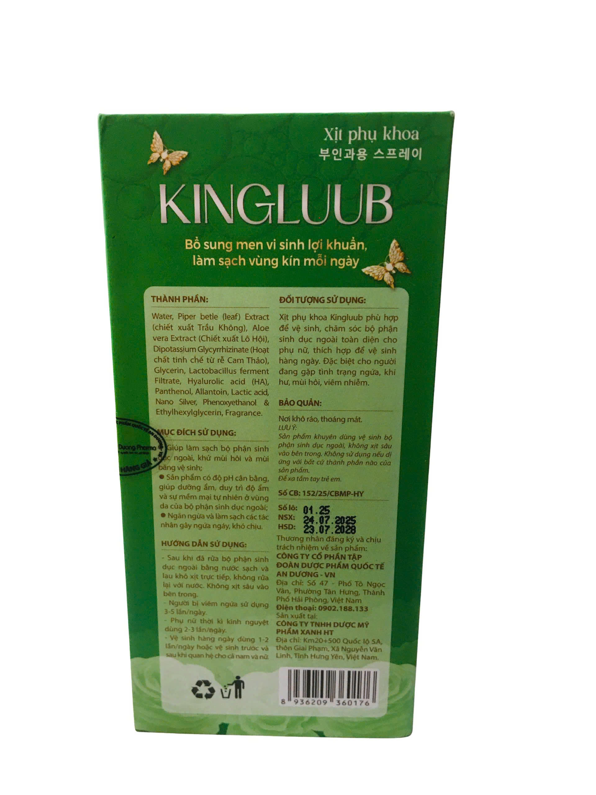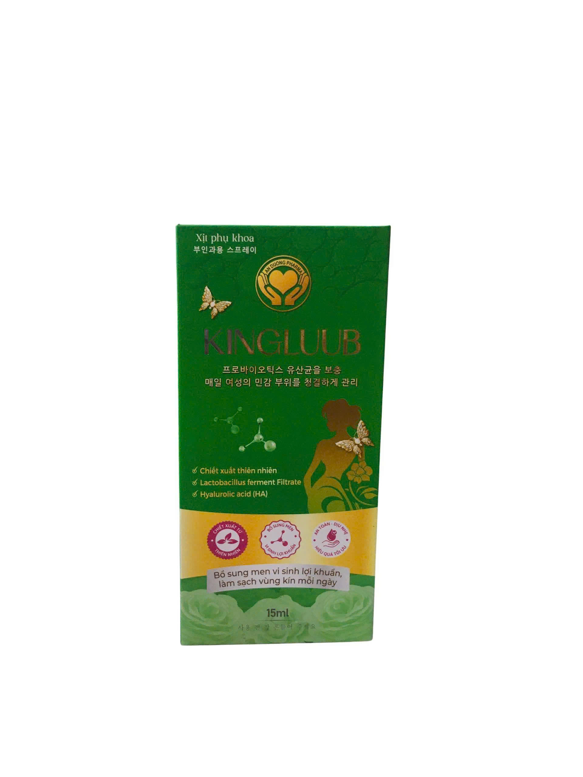 - Xịt phụ khoa Kingluub là sản phẩm chăm sóc vùng kín được bào chế từ những thành phần thiên nhiên kết hợp cùng hoạt chất hiện đại, mang đến giải pháp vệ sinh an toàn và hiệu quả cho phụ nữ.